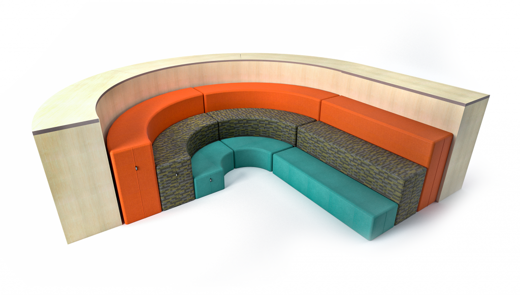 Optional screens for added privacy. Fractals Seating by Studio TK features three simple pieces: a lounge chair, an ottoman/bench and a couch with a lower or optional higher back that creates a degree of privacy. It’s designed to act as a broad canvas on which to use a variety of colours and textures to create playful looks. It’s a great addition to virtually any learning space for focused work, one on ones with students, or group projects. The Fractals collection also recently added Factals Nook, a work surface option with a high screen to create intimate desk carrel for individual focus assignments–a great option for libraries!