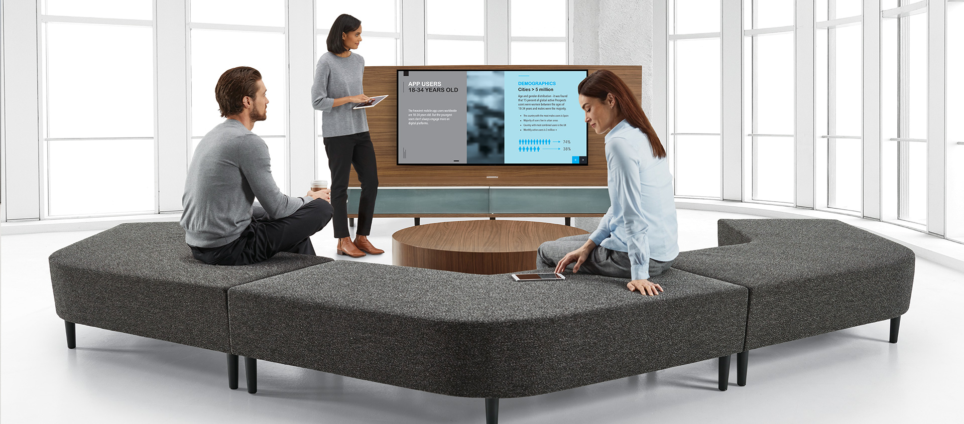Digital meetings have become a regular part of our work life, and it’ll be an essential form of communication in a hybrid workplace. Incorporating more power sources and screens will support our new way of collaborating. It will also encourage people to leave their workstation for video conferences, creating less distraction within the office. Power can be routed into a variety of commercial furniture, such as divisional panels, tables, and lounge pieces. Media units are a great way to create an instant video conferencing hub. Three h’s MEETING collection features a wide range of customizable, power integrated tables to help create supportive meeting spaces. Their Media Table features power and a mounted TV in a single unit, creating the perfect video conferencing spot.