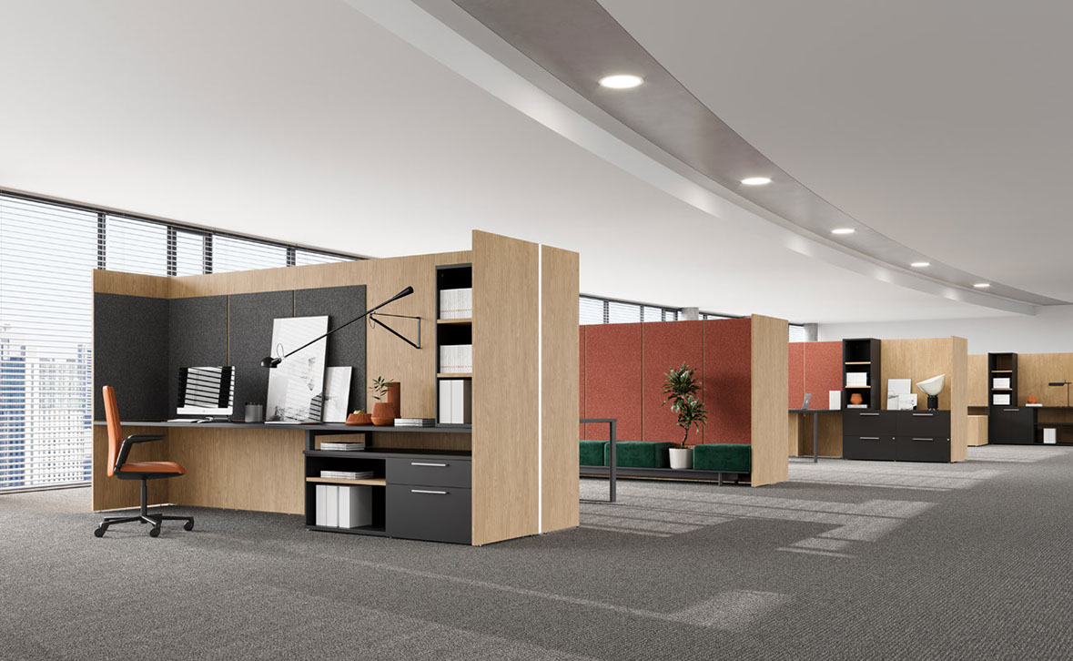 Here’s innovation at its finest! Imagine private offices without doors or walls. The MOS Tall by Canadian manufacturer Three H is a large one-inch-wide laminate divider that reaches up to 7 feet high! The additional height gives more space for private office configurations without closing off the workplace, leaving plenty of room for walk by traffic. The panels also accommodates lockers and casual seating, providing the perfect place to lounge and collaborate. The possible office configurations are infinite! Create your space your way with MOS Tall by Three H.